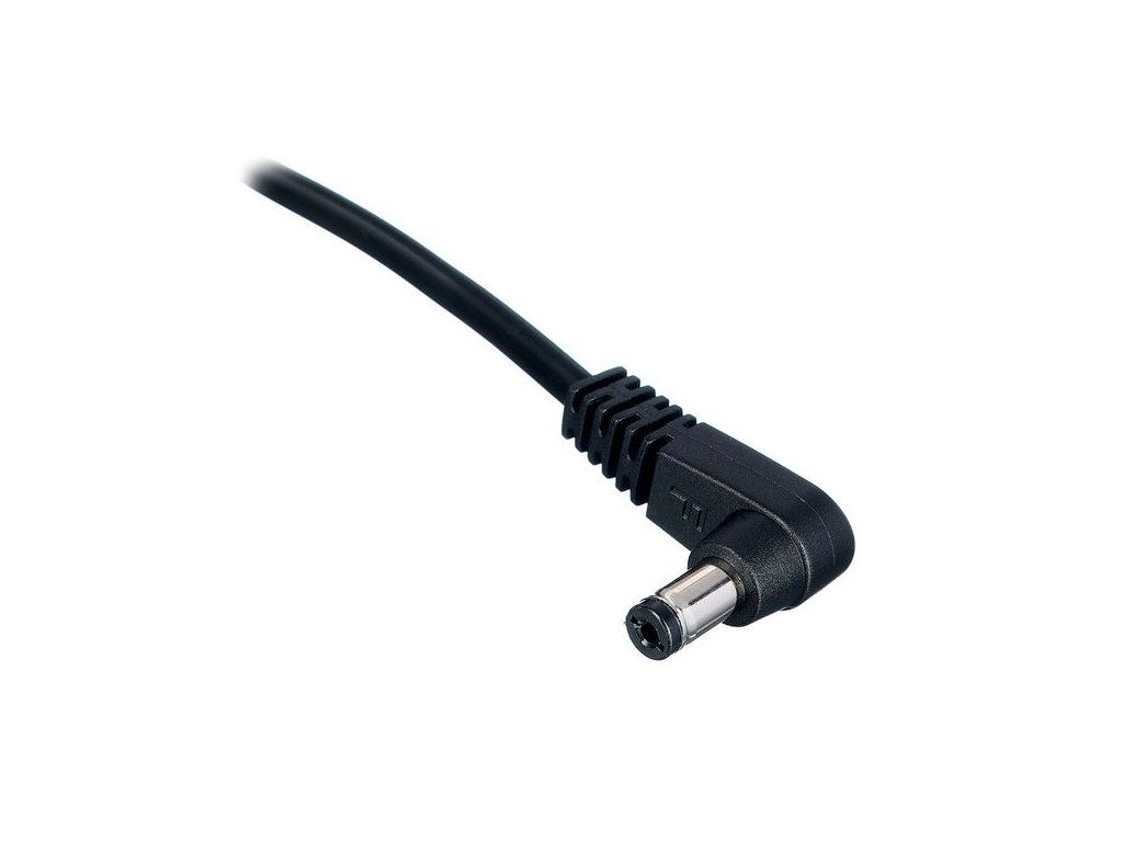Plochý propojovací kabel pro napájení kytarových efektů, úhlový konektor s vnitřním průměrem 2,1 mm, standardní polarita (střed mínus), barva černá, délka 48 cm.